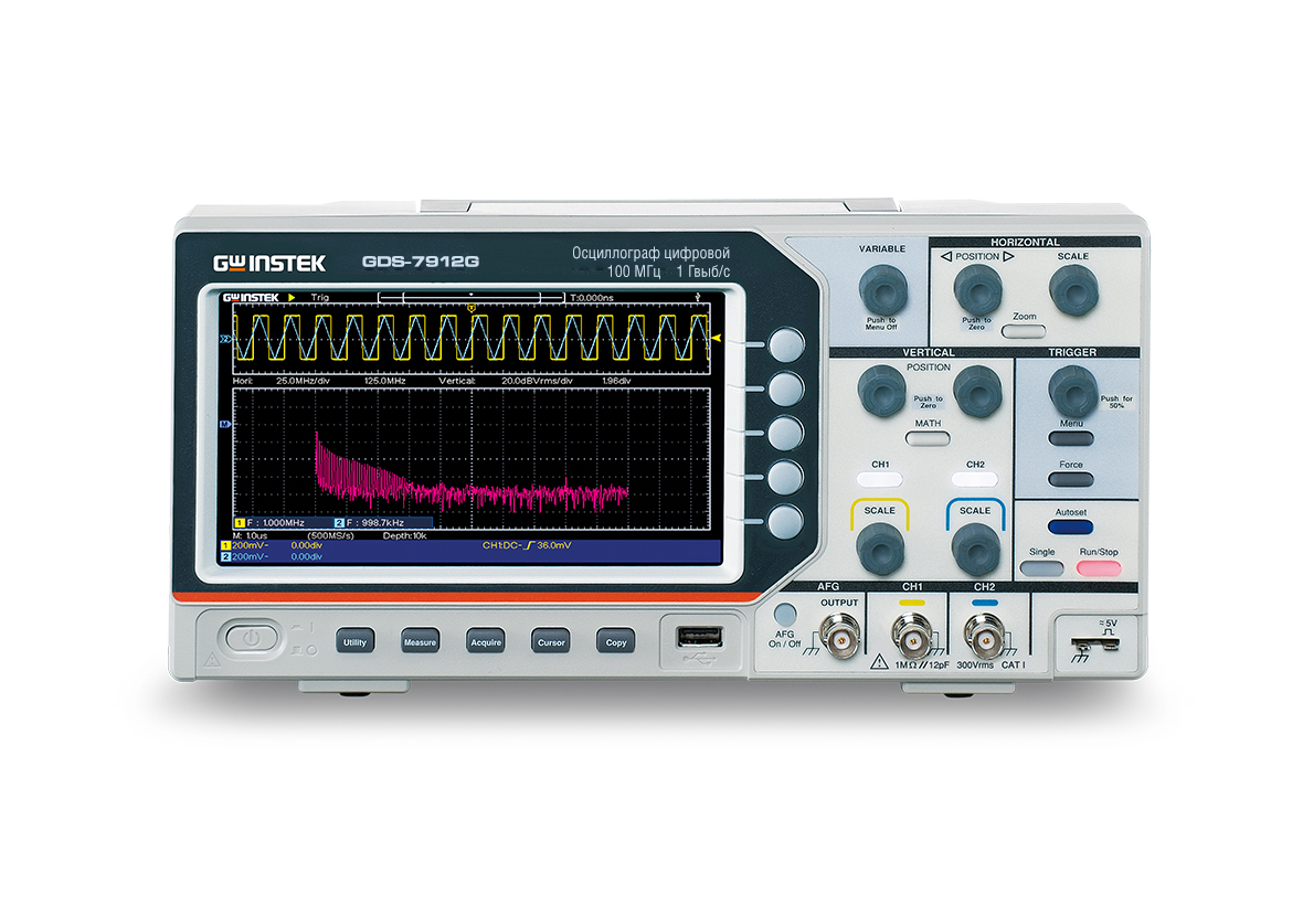 Особенности | частота дискретизации 1 ГГц/ кан на длине записи 1000 точек. Встроенный генератор СПФ - 1 канал (до 25 МГц), 4 базовых и 16 форм сигналов произв. формы, ЦАП 14 бит, дискретизация 125 МГц. Автоизмерения (30 параметров), курсорные измерения, функции математики - сложение, вычитание, умножение, деление. Режимы сбора данных - выборка, пиковый детектор (>2,5 нс), усреднение (4 … 128), ZOOM (растяжка). Частотный анализ (БПФ) на участке 2048 точек (с.к.з./ дБ). Внутренняя память 16 осциллограмм, 8 профилей настроек, 6-разрядный частотомер |