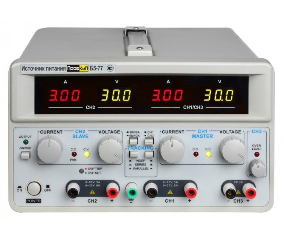 Источник питания ПрофКиП Б5-77 создан для питания стабилизированным напряжением и током узлов, и схем радиоэлектронной аппаратуры, при проведении работ в процессах наладки, ремонта и лабораторных исследований. Источник питания отличается от аналогичных моделей малым уровнем шумов и пульсаций выходного напряжения и тока. Прибор включен в государственный реестр средств измерений РФ и допущен к применению в сфере метрологического контроля.