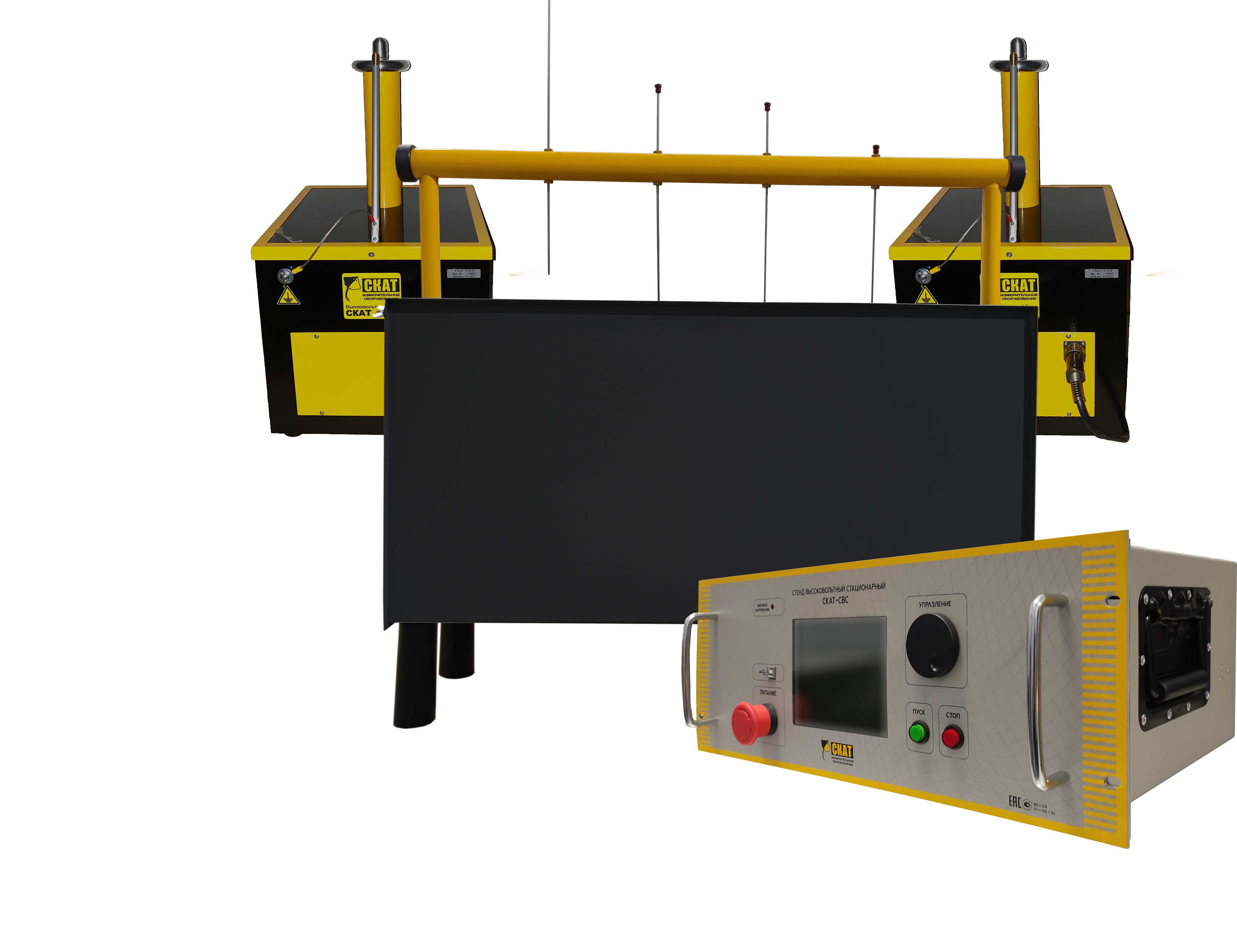 Стенд высоковольтный стационарный СКАТ-СВС создан для проведения приёмосдаточных и эксплуатационных электрических испытаний средств защиты (изоляционные штанги, резиновые боты, перчатки, электроинструмент и т.п.) переменным напряжением промышленной частоты. Также оборудование стенда может использоваться для испытаний изоляции переменным током (кабелей, изоляторов).