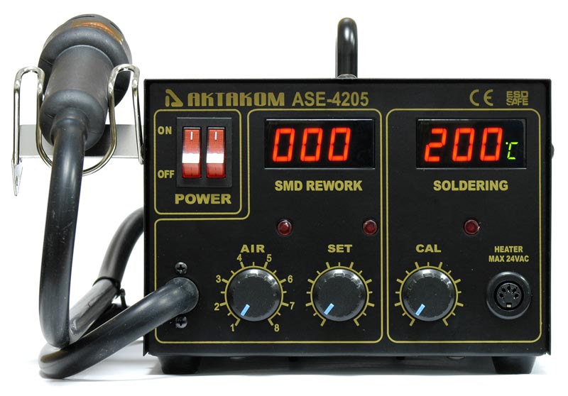 Ремонтная система с термовоздушным каналом и каналом для монтажа ASE-4205 оснащена интеллектуальной системой охлаждения с автовыключением. Применяется в производственных помещениях для монтажа электро-радиоэлементов, чувствительных к статическому электричеству. Имеет антистатическое исполнение и широкую номенклатуру сменных наконечников.